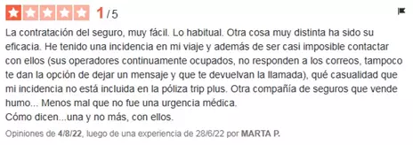 No hemos encontrado numerosos testimonios desfavorables sobre esta empresa aseguradora. De hecho, resultó arduo hallar comentarios de usuarios que hayan utilizado su seguro. A continuación, compartiremos la experiencia positiva de uno de ellos, extraída del portal Opiniones Verificadas: