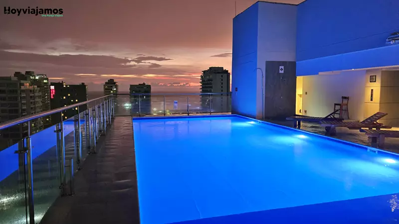 Además, este alojamiento en Santa Marta cuenta con una piscina en la azotea con vistas al mar Caribe que es una auténtica maravilla. Ver el atardecer desde allí fue uno de esos pequeños grandes momentos del viaje. A eso se suman habitaciones amplias y cómodas, un desayuno muy completo y un gimnasio bien equipado, algo que siempre valoramos cuando viajamos varios días.