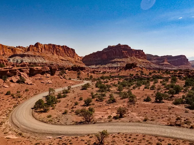 Cuando lleguéis a Fruita Barn, estaréis en la carretera más famosa del parque, la Scenic Drive. Si recorremos los 10 kilómetros de esta carretera, podréis observar las vistas más bonitas del Parque Nacional Capitol Reef. La Scenic Drive termina en Picnic Shelter, pero nosotros os recomendamos que avancéis por el cañón hasta el inicio del Capitol Gorge Trailhead. Una vez entréis dentro del cañón, os prometemos que disfrutaréis mucho con las vistas y la experiencia de conducir por ahí dentro. Este sin duda es un sitio obligado que tiene que estar en vuestra lista de sitios ver en Capitol Reef en un día.